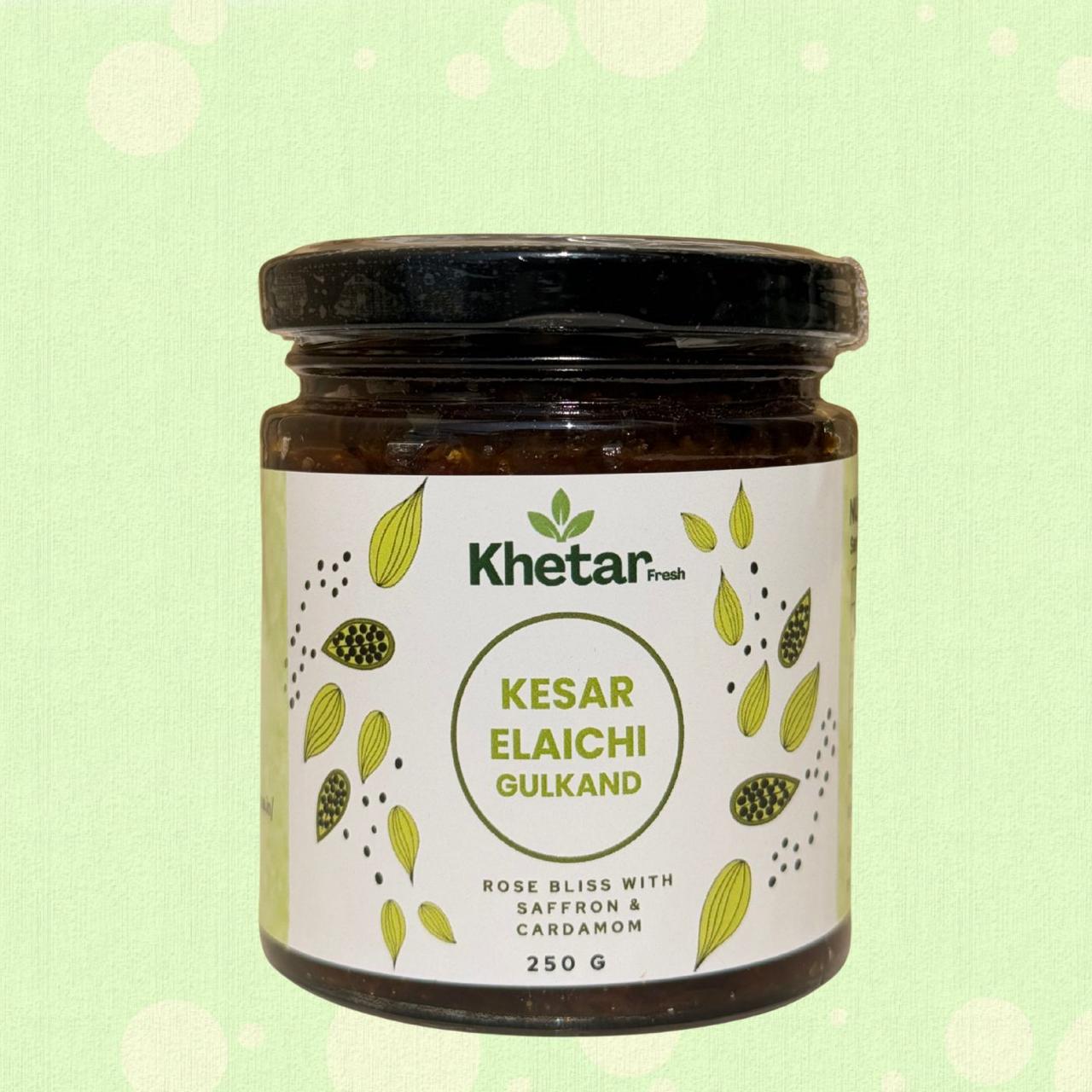 An exotic twist on tradition — Khetar Kesar Elaichi Gulkand blends Damask rose petals, premium Kashmiri saffron (kesar), and freshly crushed cardamom (elaichi) to create a luxurious, aromatic treat. This blend enhances mood, aids digestion, and adds a royal touch to your meals. Every spoonful offers natural cooling, energy-boosting, and rejuvenating benefits, crafted from 100% organic ingredients with no preservatives or artificial colors.