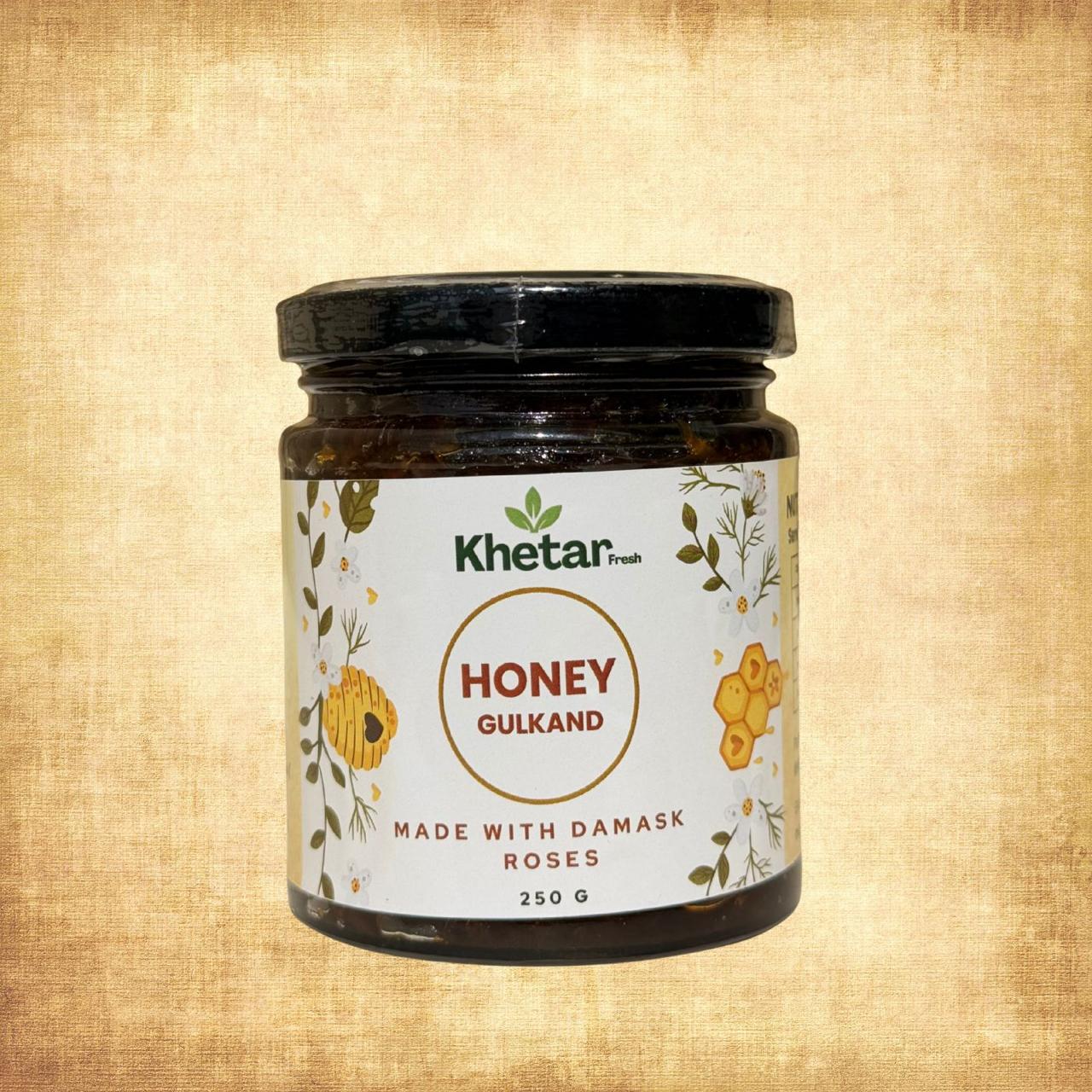 Sweetened with pure multifloral honey instead of sugar, Khetar Honey Gulkand is a perfect fusion of natural sweetness and floral freshness. Made from organic Damask roses and raw honey, it’s loaded with enzymes, antioxidants, and nutrients that boost immunity and promote gut health. This sugar-free, preservative-free rose gulkand is ideal for those seeking healthy indulgence with a delicious taste. Enjoy it as a natural dessert or with milk, toast, or paan.